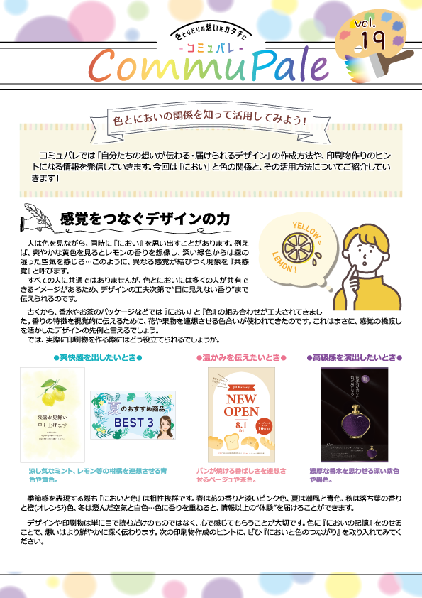 色彩の知識に基づいた印刷提案を行っております。色彩の知識を活かして作成された『コミュパレ』を通じて、