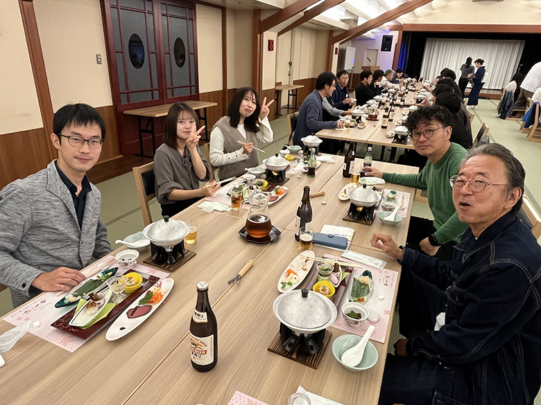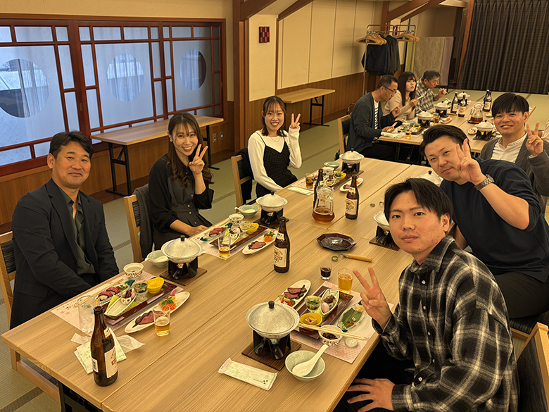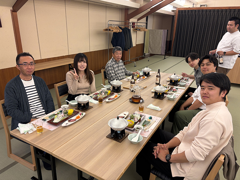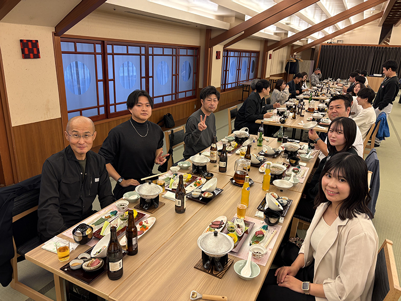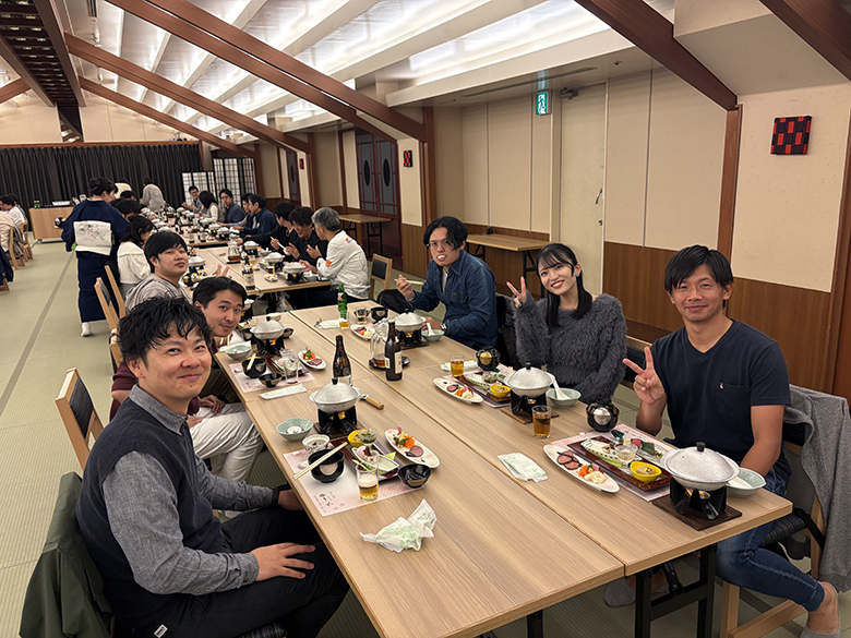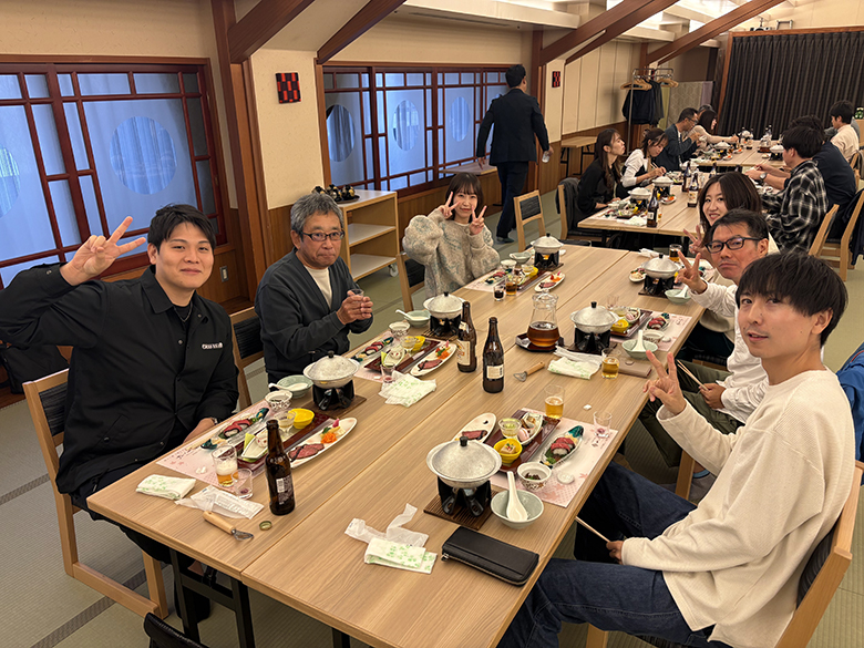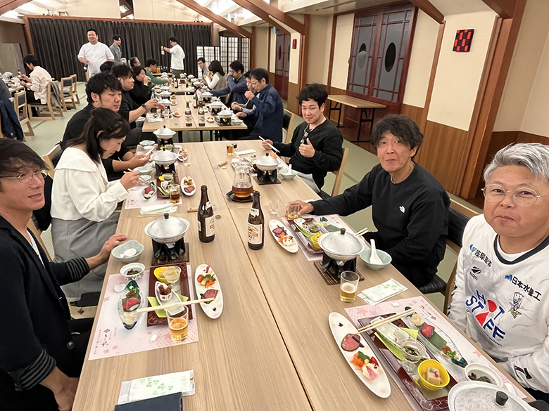 2025年10月25日、十八楼にて懇親会を行いました。昨年と同様に「美味しい食事を頂く懇親会」となり、6人掛けのテーブルに若手社員とベテラン社員、異なる部署や支店のメンバーがシャッフルして同時に座する状況で、普段はなかなか顔を合わすことのできない社員と交流し、親睦を深めました。
